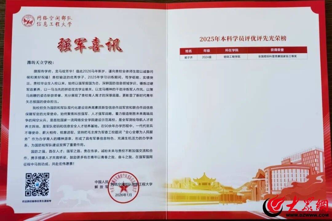 r这份荣誉不仅是郭子皆同学好学善念念、悉力拼搏的后果,更彰显了潍坊天立学校多元育东说念主的丰硕顺利。感谢网罗空间队列信息工程大学的经心教养,潍坊天立学校将不时谨守育东说念主初心,为学子成长赋能,助力更多天立少年奔赴山海、再创佳绩!